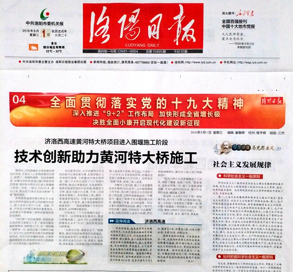 8月1日,《洛陽(yáng)日?qǐng)?bào)》04版刊發(fā)文章《技術(shù)創(chuàng)新助力黃河特大橋施工》,對(duì)公司黃河特大橋項(xiàng)目技術(shù)創(chuàng)新進(jìn)行了報(bào)道。
