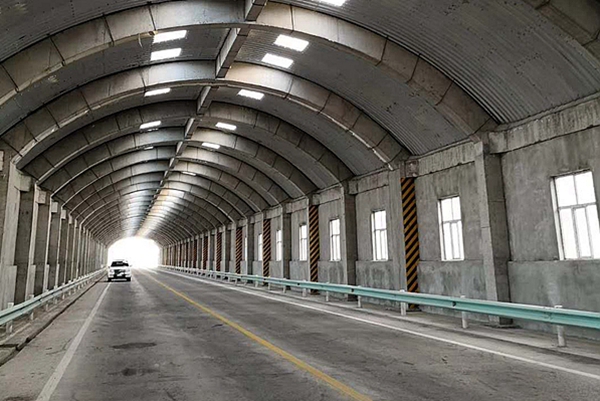 S201線路途徑瑪依塔斯風(fēng)區(qū),公司所承建的防風(fēng)雪試驗工程在風(fēng)雪災(zāi)害最為嚴(yán)重的路段。該項目采用在路面上方建設(shè)一座仿造隧道式的棚洞,并用防雪網(wǎng)與擋雪板對棚洞的進(jìn)出口及風(fēng)吹雪嚴(yán)重路段進(jìn)行防護(hù),以防止吹雪在路面和棚洞洞口處堆積造成通行困難。棚洞主體采用鋼筋混凝土框架結(jié)構(gòu),能抵抗12級大風(fēng)。為了行車安全,還在棚洞內(nèi)部設(shè)置了波形梁護(hù)欄。該項目也是目前國內(nèi)首例采用棚洞工程進(jìn)行吹雪防治的嘗試,開辟了新疆地區(qū)科技創(chuàng)新成果與實際工程結(jié)合應(yīng)用的新篇章。