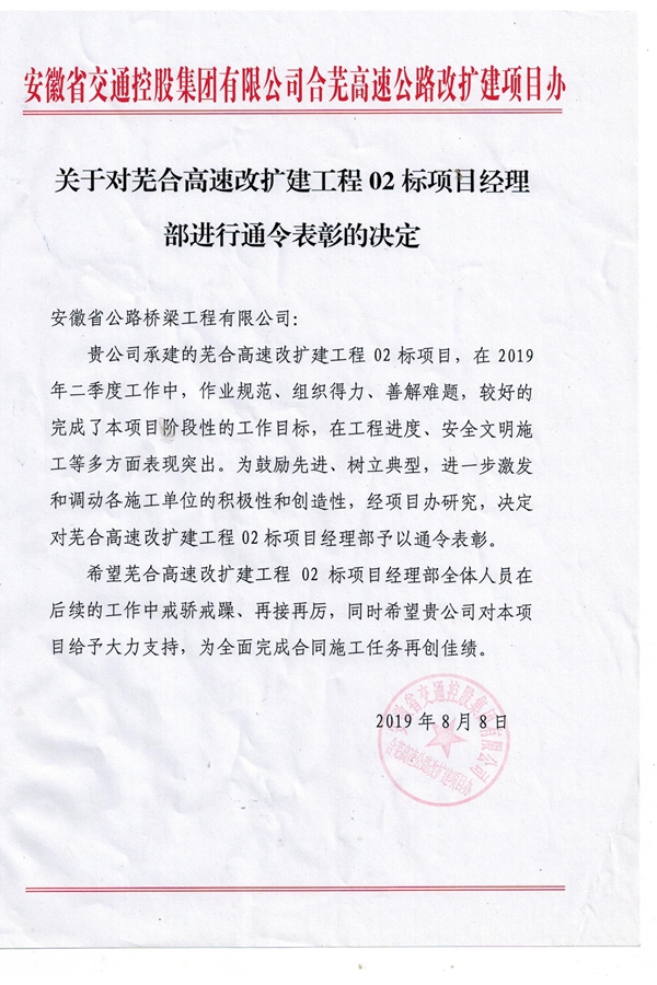 近日,合蕪02標(biāo)收到來自項(xiàng)目辦簽發(fā)的通令表彰文件,對項(xiàng)目在二季度較好完成階段性工作目標(biāo)給予肯定,對項(xiàng)目工程進(jìn)度、安全文明施工等方面取得的突出成績表示贊揚(yáng)。