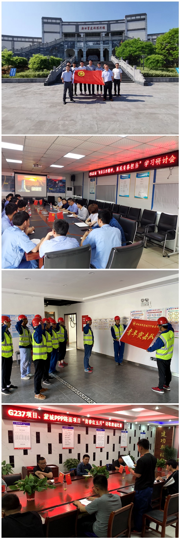 涇縣PPP路面項(xiàng)目團(tuán)支部組織青年團(tuán)員參觀新四軍史料陳列館、新四軍軍部舊址和皖南事變烈士陵園,重溫中國(guó)共產(chǎn)黨領(lǐng)導(dǎo)中國(guó)人民取得勝利的光輝斗爭(zhēng)史,緬懷革命先烈,接受紅色文化洗禮。舒城三里河路面項(xiàng)目組織開展“弘揚(yáng)五四精神 踐行青春誓言”主題團(tuán)日活動(dòng),團(tuán)員青年共同回顧五四運(yùn)動(dòng)歷史,就自身職業(yè)發(fā)展和如何繼承發(fā)揚(yáng)五四精神進(jìn)行座談交流。G237項(xiàng)目聯(lián)合蒙城PPP項(xiàng)目組織開展紅色詩(shī)歌誦讀活動(dòng),用別樣的方式表達(dá)團(tuán)員青年對(duì)祖國(guó)的深愛之情。