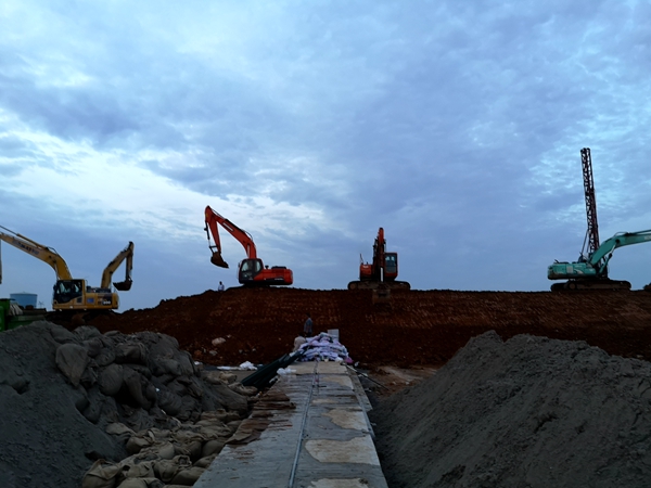 巢湖市東外壞旗山撇洪溝,位于巢湖鼓山腳下,連接清溪河支流,連日降雨,清溪河水位暴漲,防汛壓力巨大,經(jīng)開區(qū)的人民生命和財產(chǎn)安全受到嚴重威脅。經(jīng)巢湖市政府研究決定,在旗山撇洪溝和清溪河支流交匯處筑壩,將撇洪溝東側低洼處作為清溪河支流泄洪預備區(qū),以應對清溪河水位暴漲危險。接到汛情指令,巢湖市亞父路項目部迅速出動,組建防汛突擊隊,調集挖掘機、裝載機等機械設備迅速奔赴搶險一線,連續(xù)奮戰(zhàn)兩天三夜,填筑黃土近10000方,碎石1500方,拋石700噸,圓滿完成了底寬22米,上寬10米,高5米,長110米的筑壩任務,確保了經(jīng)開區(qū)的人民生命和財產(chǎn)安全。
