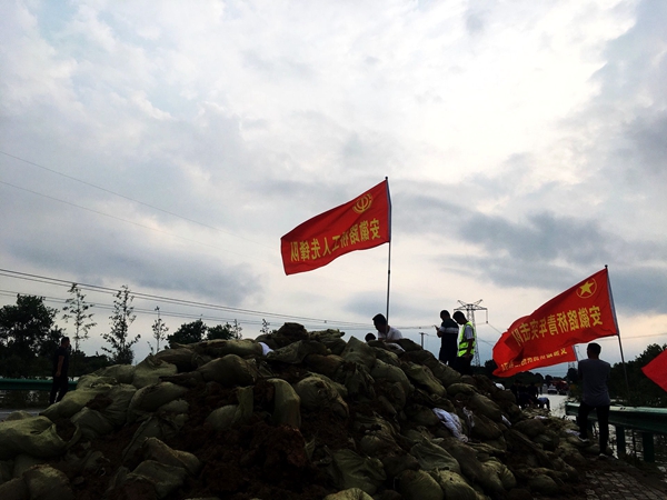 7月23日下午5時(shí),石頭鎮(zhèn)水位上漲迅猛,廬江縣重要防汛通道X092線150米漫水公路淹沒(méi),嚴(yán)重威脅當(dāng)?shù)厝罕娚钜约胺姥闯鲂?。徽州大道?xiàng)目迅速行動(dòng),組織人員70余人,機(jī)械數(shù)十臺(tái),挖土2000方,裝填沙袋5000只,構(gòu)筑起兩道安心墻。