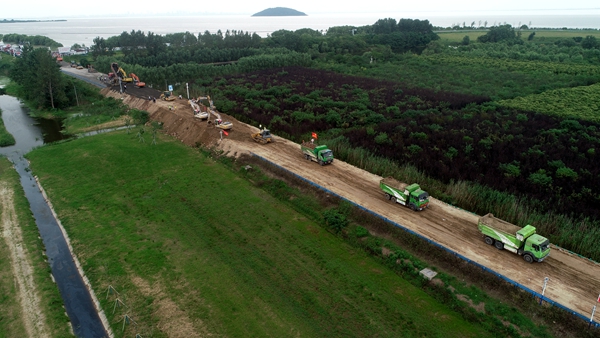24日,環(huán)巢湖大道杭埠河堤壩上一片忙碌,路橋的抗洪尖兵們要和不斷上漲的湖水搶時(shí)間。從23日凌晨1時(shí)到24日17時(shí),經(jīng)過40多個(gè)小時(shí)的連續(xù)作業(yè),安徽路橋順利完成道路抬升任務(wù),基本具備通行條件。但是為進(jìn)一步提高通行舒適性和道路、堤壩耐久性,突擊隊(duì)伍繼續(xù)戰(zhàn)斗,開始道路水穩(wěn)施工。