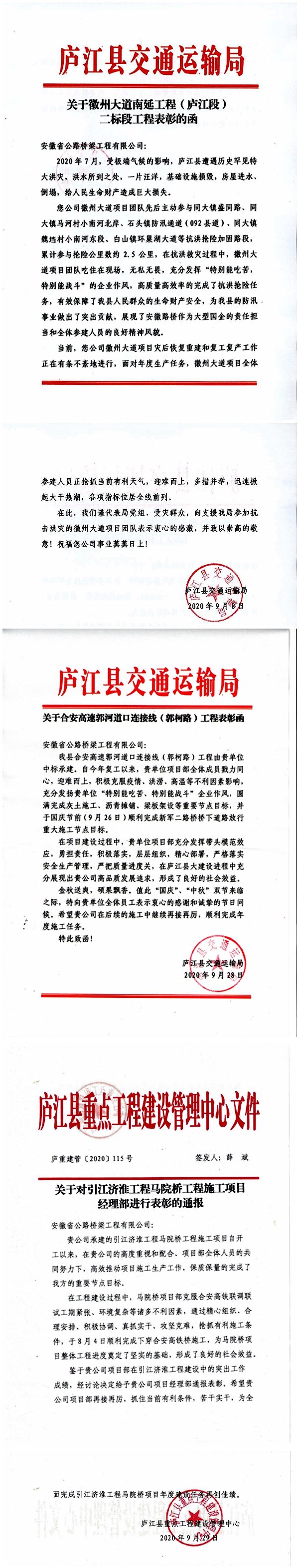 近日,廬江縣交通運輸局、廬江縣重點工程建設管理中心先后發(fā)來表彰信,對公司承建的徽州大道南延工程(廬江段)二標段、合安高速郭河道口連接線(郭柯路)工程、引江濟淮馬院橋工程項目戰(zhàn)疫情、抗洪水、搶進度、樹形象,高標準、高質(zhì)量推進施工生產(chǎn)給予表揚和感謝。