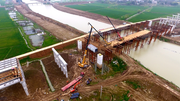 羅埠河特大橋是下承式鋼箱提籃系桿拱橋,是該項(xiàng)目關(guān)鍵工程。大橋跨越羅埠河兩岸防洪大堤及整個(gè)河床,橋梁全長1213米, 主跨160米,鋼梁總重為5820噸。首件鋼箱梁吊裝的順利完成,為后續(xù)鋼箱梁塊體的現(xiàn)場施工提供了經(jīng)驗(yàn)和技術(shù)支持,標(biāo)志著羅埠河特大橋進(jìn)入安裝施工階段。