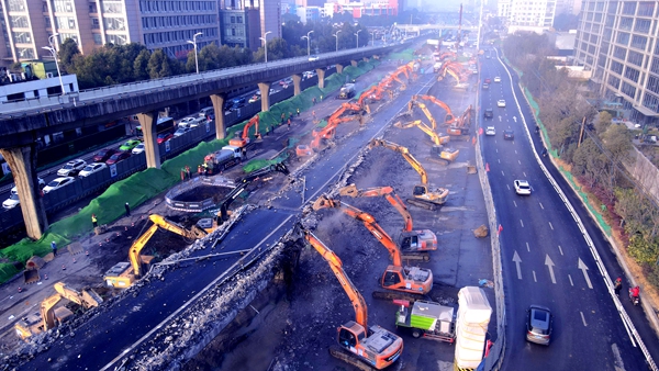 2020年12月4日22時,項目封閉施工,正式吹響大干的號角。26天后,首根墩柱順利澆筑。2月3日,30臺大型破碎機(jī)組成“鋼鐵戰(zhàn)隊”,僅用15個小時便完成了原計劃兩天才能完成的匝道拆除任務(wù)。3月25日,經(jīng)過35天的持續(xù)奮戰(zhàn),主線橋第四聯(lián)順利架設(shè),提前拉開了上部結(jié)構(gòu)施工的序幕。