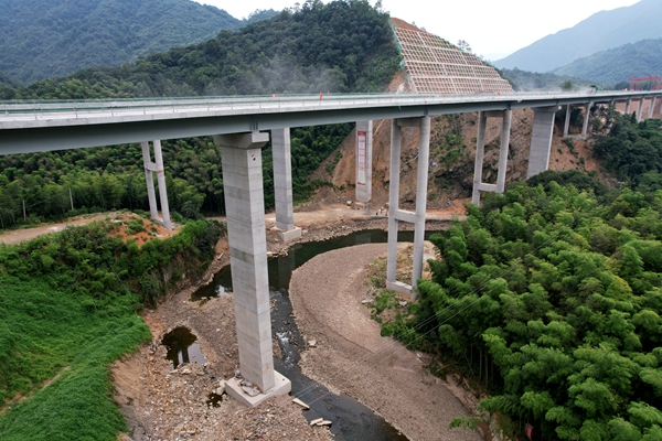真正敢于挑戰(zhàn)的建設(shè)者,需要非凡的毅力和勇氣。位于標(biāo)頭的徽水河大橋進(jìn)場(chǎng)時(shí),每一臺(tái)機(jī)械設(shè)備都“寸步難行”,每一米道路修筑都要用爆破方式挖掉硬石。他們歷經(jīng)雨水、烈日的輪流考驗(yàn),立起了一排排筆直的墩柱,架起了一片片堅(jiān)實(shí)的梁板,將最艱難的1公里鍛造而成。
