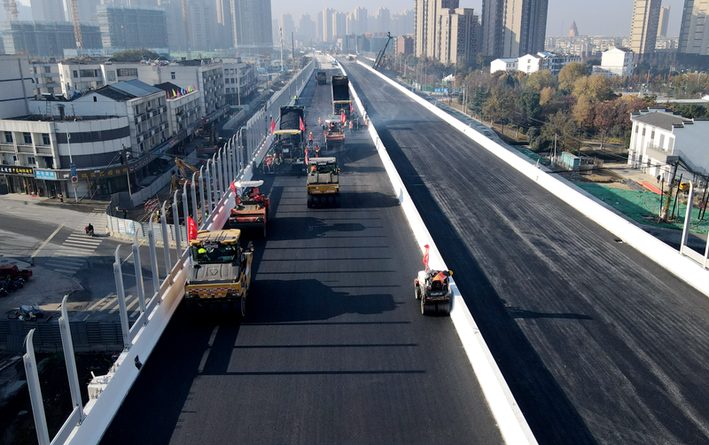【百日攻堅(jiān)大會戰(zhàn)】金寨南路快速化改造(望水路-站前路)項(xiàng)目主橋?yàn)r青路面開始攤鋪
