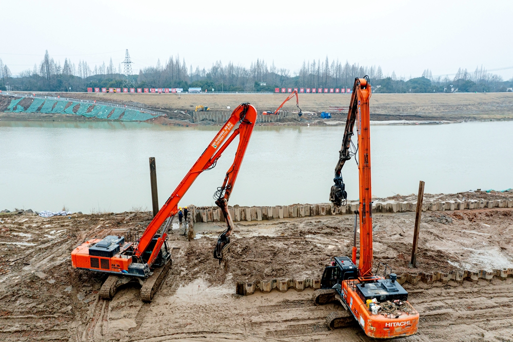 青弋江特大橋主墩鋼圍堰平面尺寸長40米、寬16.2米、高18米、標高7.5米,共計390根鎖口拉森鋼板樁,施工方案為東、西兩岸主墩圍堰施工同步進行。除夕前夜,隨著青弋江東岸最后一根鎖口拉森鋼板樁施工結(jié)束,該橋正式轉(zhuǎn)入圍檁施工階段,全面掀起了春節(jié)施工大干熱潮。截至大年初五,項目順利完成第一道圍檁施工任務(wù),為春節(jié)期間全面完成圍檁施工任務(wù)奠定了堅實的基礎(chǔ)。