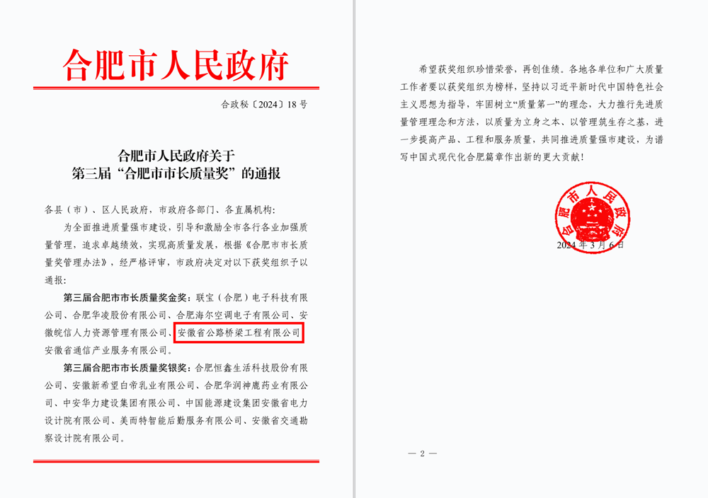 近日,合肥市人民政府公布了第三屆“合肥市市長質(zhì)量獎(jiǎng)”名單,安徽路橋獲評(píng)金獎(jiǎng)。
