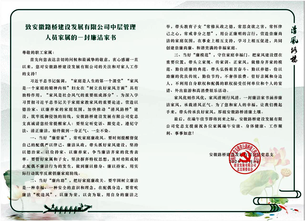 建設(shè)公司深入貫徹落實集團紀委陽光、清廉、建工“六個一”廉潔文化創(chuàng)建工作部署,積極推進“清廉”之家建設(shè)。組織開展“5·10思廉日”活動,為50余名管理人員發(fā)放廉潔家書,進一步加強家風(fēng)家教建設(shè),將家庭親情融入職工廉潔教育中;組織參與公司紀委讀書月讀廉書活動,擇優(yōu)推薦3幅讀廉書作品。組織職工積極參加公司信息化“廉潔知識測試”活動,促進黨員干部職工以考促學(xué)、以學(xué)促廉。