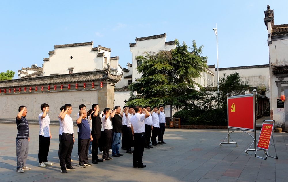 在巖寺新四軍軍部舊址紀(jì)念館,參加活動(dòng)人員學(xué)習(xí)了解了新四軍在各個(gè)階段的重大事件、戰(zhàn)斗歷程以及整編的重大意義,感受革命先烈的豐功偉績(jī)及老一輩革命家為理想艱苦奮斗、流血犧牲、奮勇前進(jìn)的偉大精神。全體黨員在革命先烈的銅像前,面對(duì)黨旗,重溫入黨誓詞。