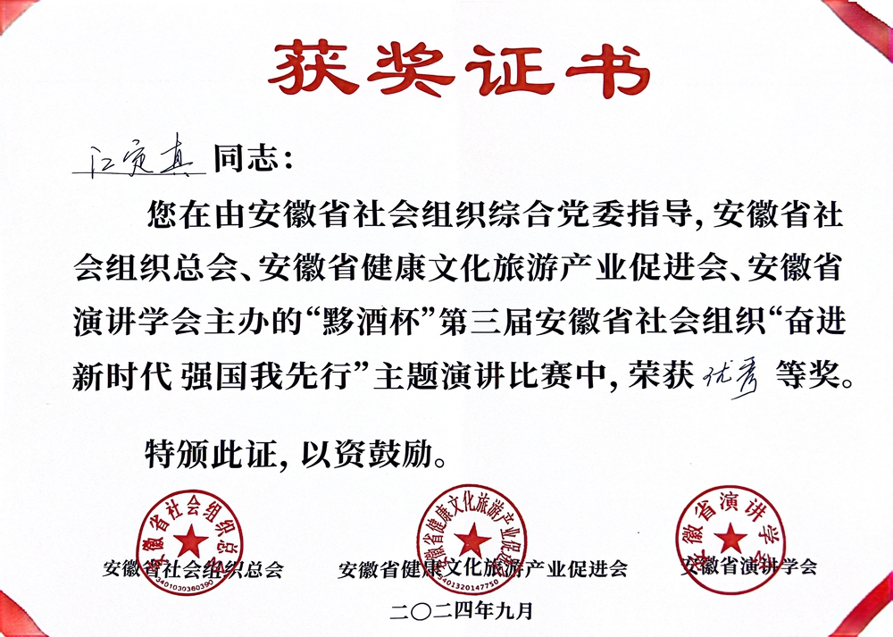 9月21日,第三屆安徽省社會(huì)組織“奮進(jìn)新時(shí)代 強(qiáng)國(guó)我先行”主題演講比賽復(fù)賽、決賽在合肥舉行,公司選送參賽選手江定真參加角逐,經(jīng)過(guò)激烈比拼,榮獲優(yōu)秀獎(jiǎng)。