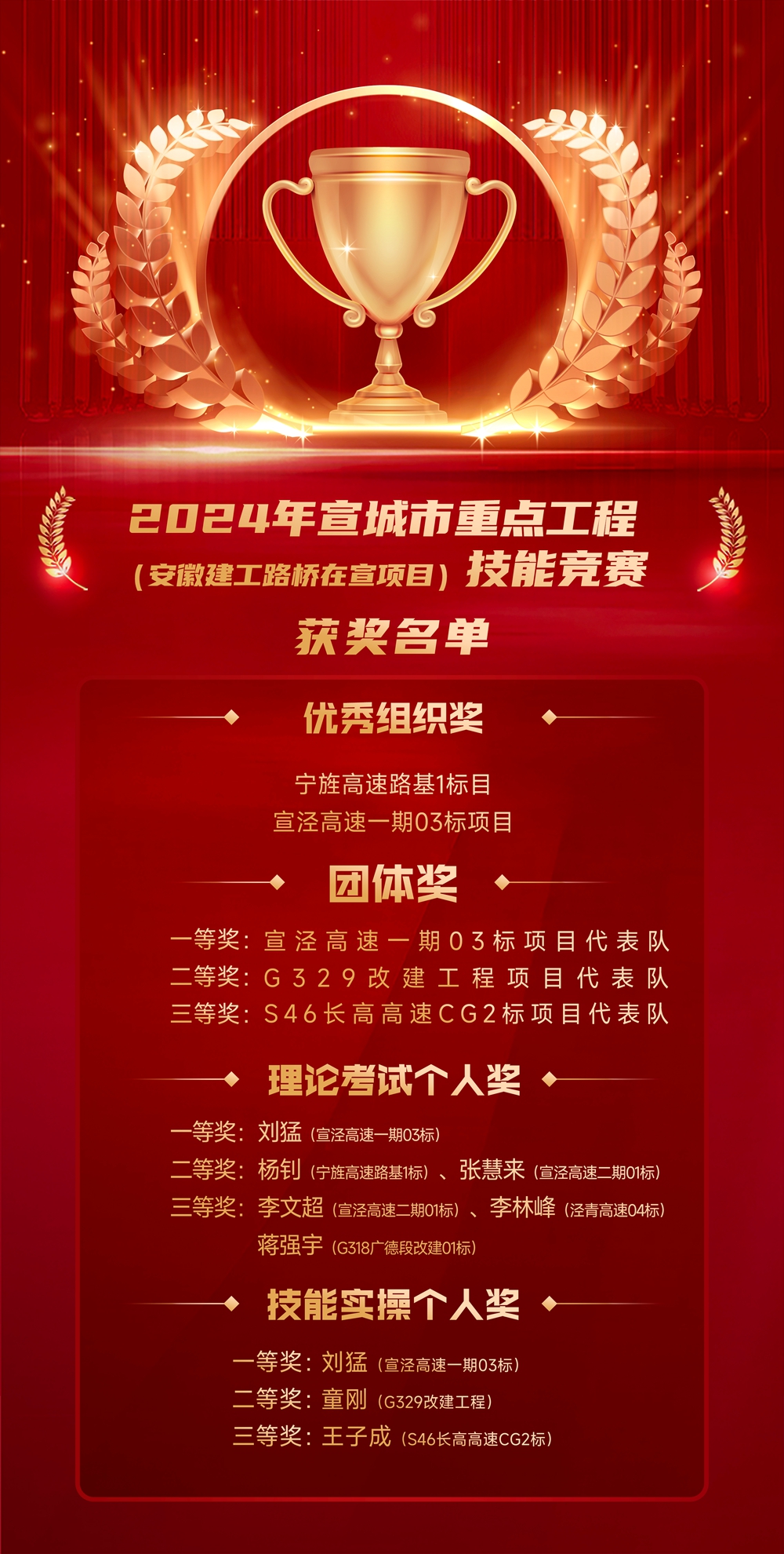 經(jīng)過一天的激烈角逐,宣涇高速一期03標代表隊、G329改建工程項目代表隊和S46長高高速2標代表隊分別獲得團體一、二、三等獎;寧旌高速路基01標和宣涇高速一期03標分別獲得優(yōu)秀組織獎。此外,還分別對理論考試和技能實操單項成績前6名和前3名的選手頒發(fā)了榮譽證書。