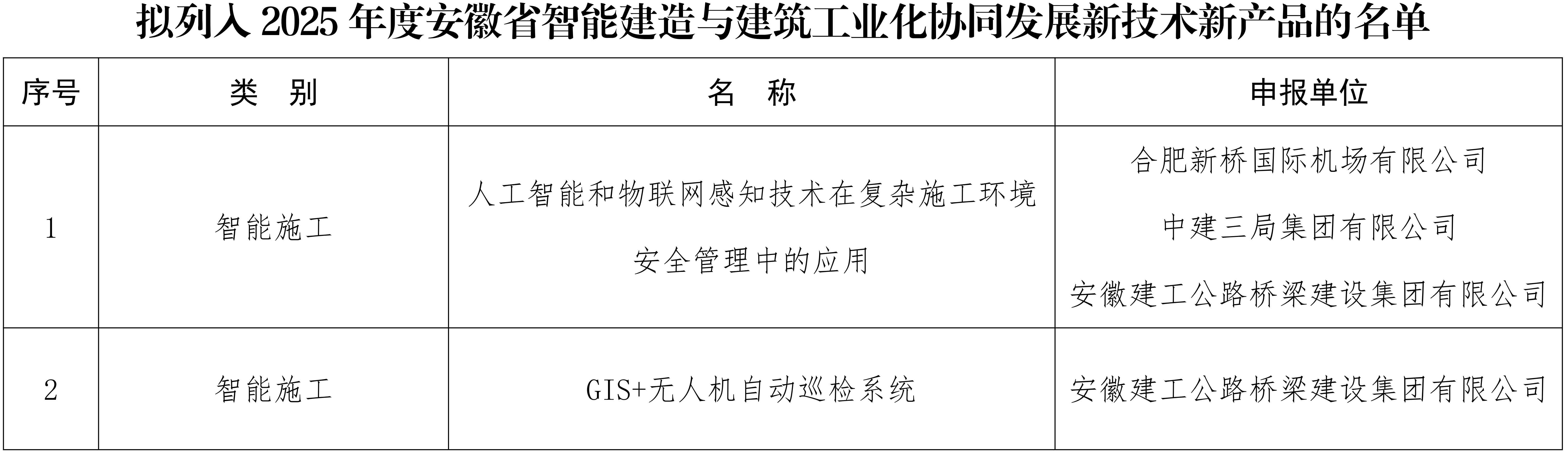 近日,安徽省住房和城鄉(xiāng)建設廳公布了2025年度安徽省智能建造與建筑工業(yè)化協(xié)同發(fā)展新技術(shù)新產(chǎn)品及試點項目,公司“新橋機場S1線土建施工總承包3標”、“新橋機場S1線合肥西站樞紐先行段”、“合肥新橋國際機場綜合交通中心(含軌道引入)及配套工程”三個項目,“人工智能和物聯(lián)網(wǎng)感知技術(shù)在復雜施工環(huán)境安全管理中的應用”、“GIS+無人機自動巡檢系統(tǒng)”等兩項產(chǎn)品應用成功入選。