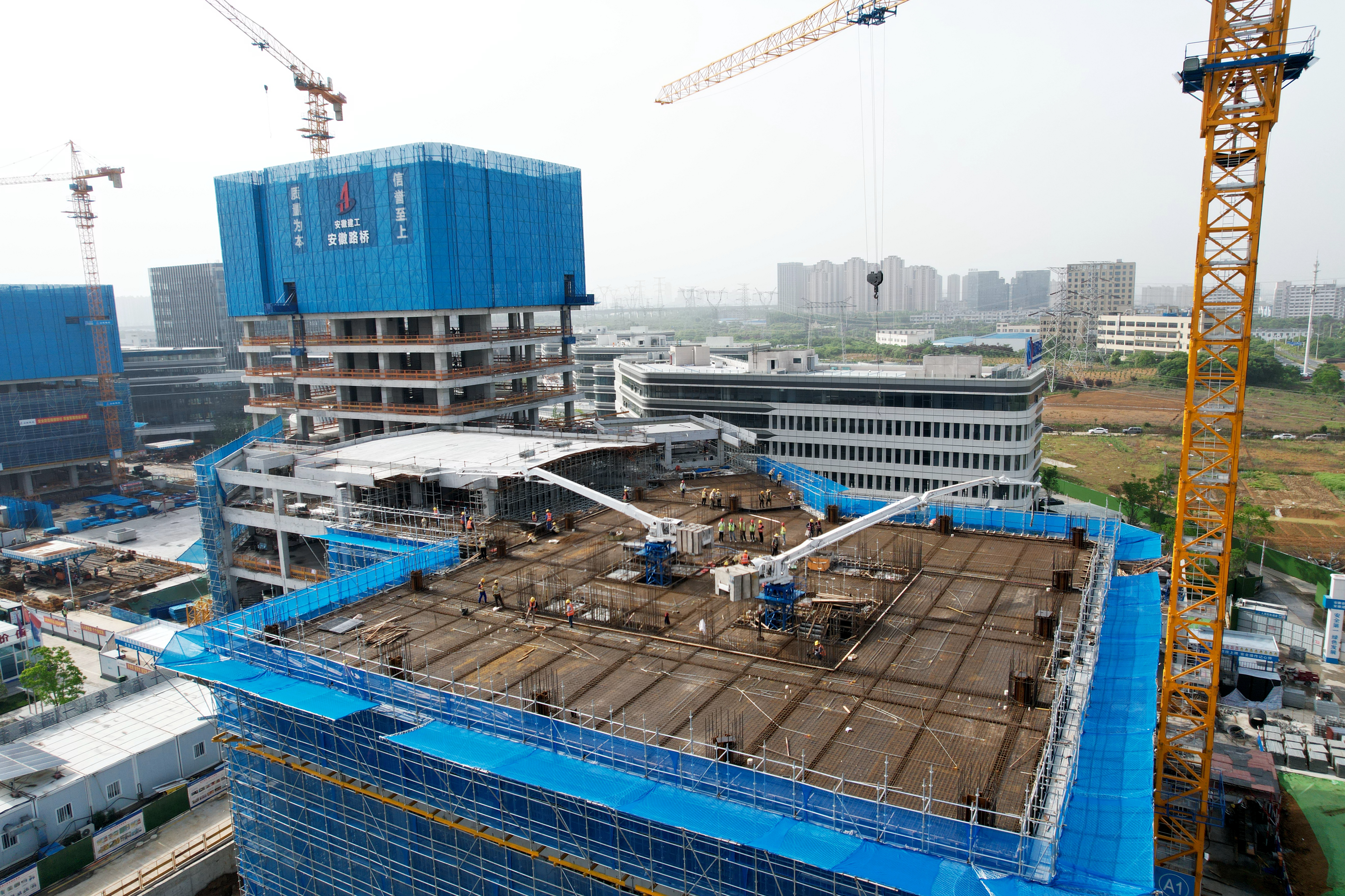 超高層混凝土與全液壓智能布料機施工技術實現(xiàn)了施工流程的智能化飛躍。布料機獨具匠心地采用3節(jié)臂“Z”形折疊設計,支持人機協(xié)同可視化遙控操作,實現(xiàn)全方位無死角布料,且不占用現(xiàn)澆板面空間與塔吊設備資源,澆筑效率大幅提升近50%。這一技術已在桃花科創(chuàng)產(chǎn)業(yè)園EPC項目成功應用,榮獲省級工法,并助力項目榮獲2023年度中國施工企業(yè)管理協(xié)會工程建設行業(yè)典型案例(智能建造)項目、合肥市智能建造新技術新產(chǎn)品創(chuàng)新服務典型案例。