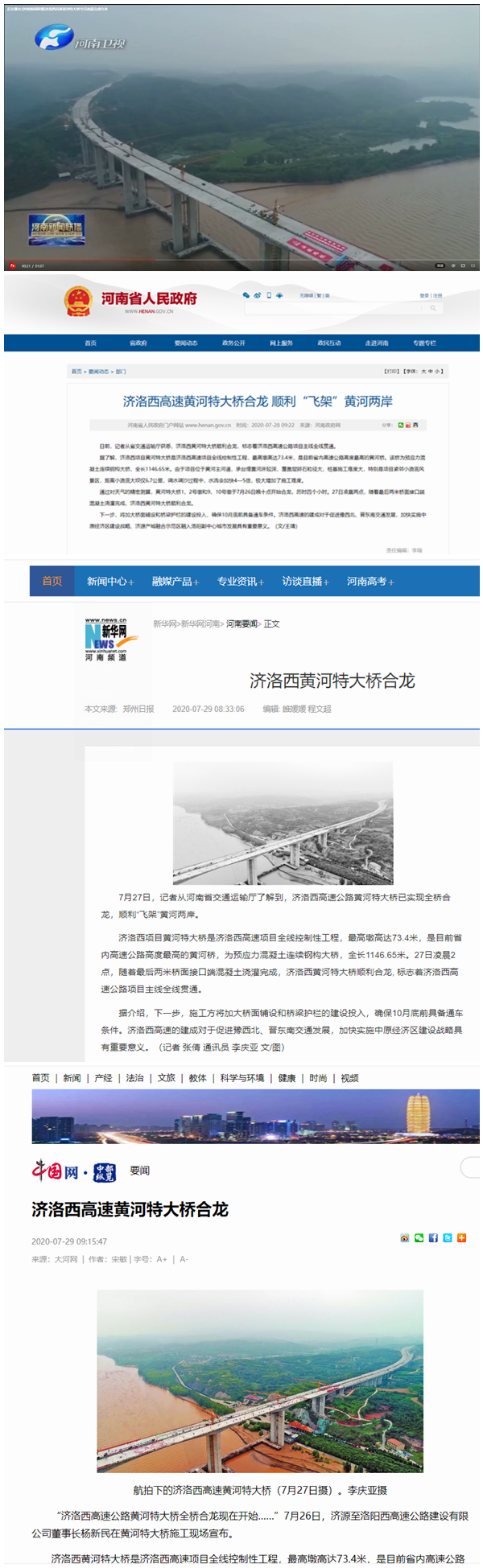 7月26日至27日,中新社、河南衛(wèi)視、河南日報、東方今報等多家省部級主流媒體,深入濟洛西高速黃河特大橋施工現場,現場采訪并共同見證了目前河南省內墩高最高的黃河特大橋合龍。