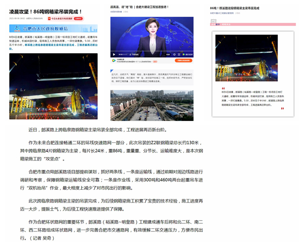 近日,人民網(wǎng)安徽頻道、合肥市廣播電視臺、合肥市人民政府等多家省市級主流媒體相繼報道了公司承建的郎溪路(裕溪路—明皇路)01標(biāo)項目建設(shè)情況。