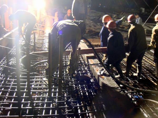 淠望路大橋主橋全長120米,共有15個(gè)節(jié)段,是整個(gè)大橋的重難點(diǎn)和關(guān)鍵控制性工程,全部采用前支點(diǎn)掛籃施工。由于施工技術(shù)含量高、施工難度大,關(guān)系到全橋的進(jìn)度與形象,是全橋施工的重中之重。開工伊始項(xiàng)目部就高度重視,提出了“向主橋要進(jìn)度、向引橋要形象”的口號(hào);多次組織專家評(píng)審施工方案、優(yōu)化施工工藝,特別是“塔梁并進(jìn)”工藝的采用,極大地促進(jìn)了工效,既縮短了工期又降低了成本。隨著工程的推進(jìn),項(xiàng)目部審時(shí)度勢(shì)的不斷優(yōu)化整合施工資源配置:在施工力量、機(jī)械設(shè)備上優(yōu)先滿足主橋施工需要。在搶時(shí)間趕進(jìn)度的同時(shí)不斷強(qiáng)化現(xiàn)場(chǎng)安全生產(chǎn)管理,并嚴(yán)把質(zhì)量關(guān),特別是會(huì)同監(jiān)控單位加強(qiáng)了對(duì)整橋線形控制,使之符合設(shè)計(jì)和施工技術(shù)規(guī)范要求,達(dá)到了預(yù)期效果。在工序無間隙、晝夜無間斷,質(zhì)量有控制、安全有保障的良好狀態(tài)下,以七至八天每節(jié)段的速度全力推進(jìn)主橋建設(shè),圓滿的完成了主橋建設(shè)的各項(xiàng)任務(wù)。