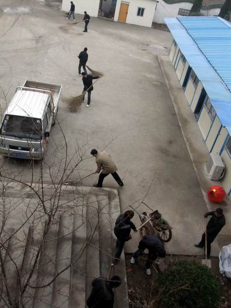 同志們各持工具,有說有笑,一時間項目部呈現(xiàn)出一派熱火朝天的景象。經過將近3個小時的清理,項目部樓道、廁所、花壇、廣場都煥然一新。