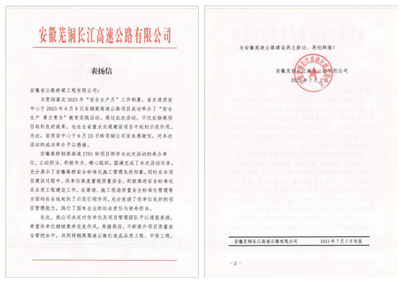 公司獲安徽蕪銅長江高速公路有限公司來信表揚(yáng)