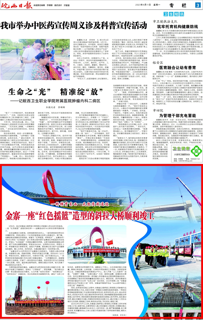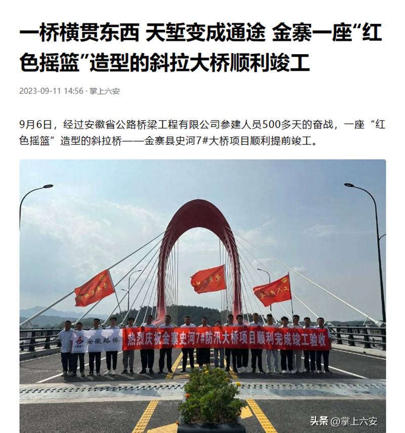 【名媒聚焦】皖西日報、今日頭條:一橋橫貫東西 天塹變成通途——金寨一座“紅色搖籃”造型的斜拉大橋順利竣工