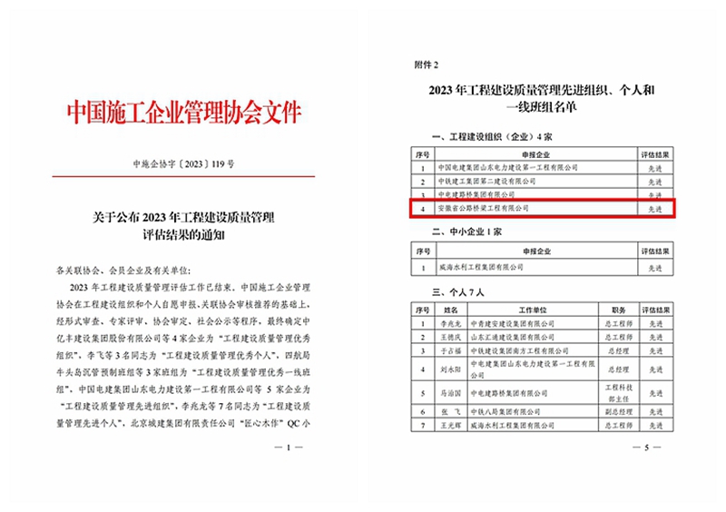 近日,中國施工企業(yè)管理協(xié)會公布了“2023年工程建設(shè)質(zhì)量管理”評估結(jié)果,公司在與眾多央企競爭角逐下脫穎而出,入選“2023年工程建設(shè)質(zhì)量管理先進(jìn)組織”,是安徽省內(nèi)唯一一家入選企業(yè)。