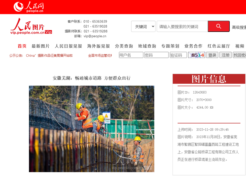 11月28日,中國新聞圖片網(wǎng)、人民網(wǎng)、安徽新聞網(wǎng)等多家央媒和省級媒體關(guān)注公司承建的繁昌區(qū)富鑫西路項目工程建設(shè),以圖組形式聚焦項目橋梁混凝土澆筑和路基施工。