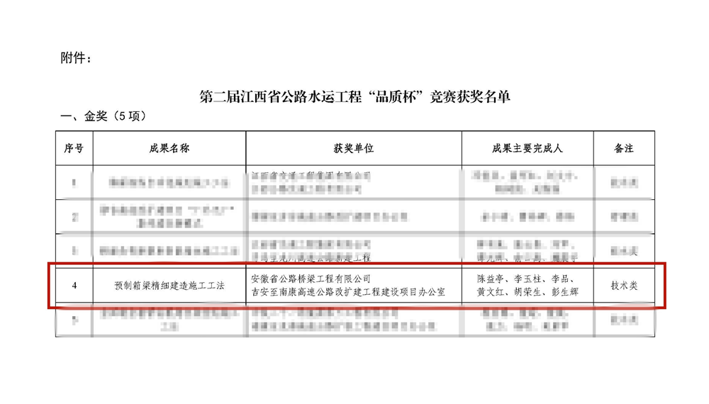 近日,江西省交通運(yùn)輸廳發(fā)布了第二屆江西省公路水運(yùn)工程“品質(zhì)杯”競(jìng)賽結(jié)果,公司承建的吉康改擴(kuò)建C1標(biāo)項(xiàng)目“預(yù)制箱梁精細(xì)建造施工工法”榮獲金獎(jiǎng)。