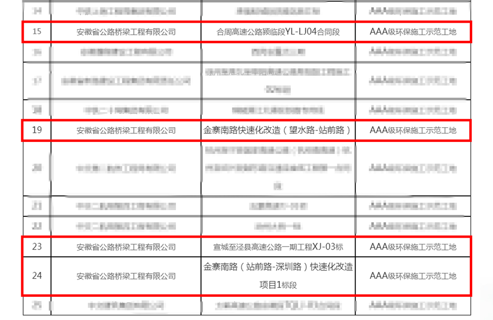 12月6日,安徽省環(huán)境保護(hù)產(chǎn)業(yè)協(xié)會(huì)公布了“2023年建設(shè)工程從業(yè)單位生態(tài)環(huán)境信用評(píng)價(jià)結(jié)果”,公司承建的合周高速潁臨段YL-LJ04標(biāo)項(xiàng)目、金寨南路快速化改造(望水路-站前路)、宣城至涇縣高速公路一期工程XJ-03標(biāo)、金寨南路(站前路-深圳路)快速化改造項(xiàng)目1標(biāo)段四個(gè)項(xiàng)目榮獲安徽省“AAA級(jí)環(huán)保施工示范工地”稱號(hào)。