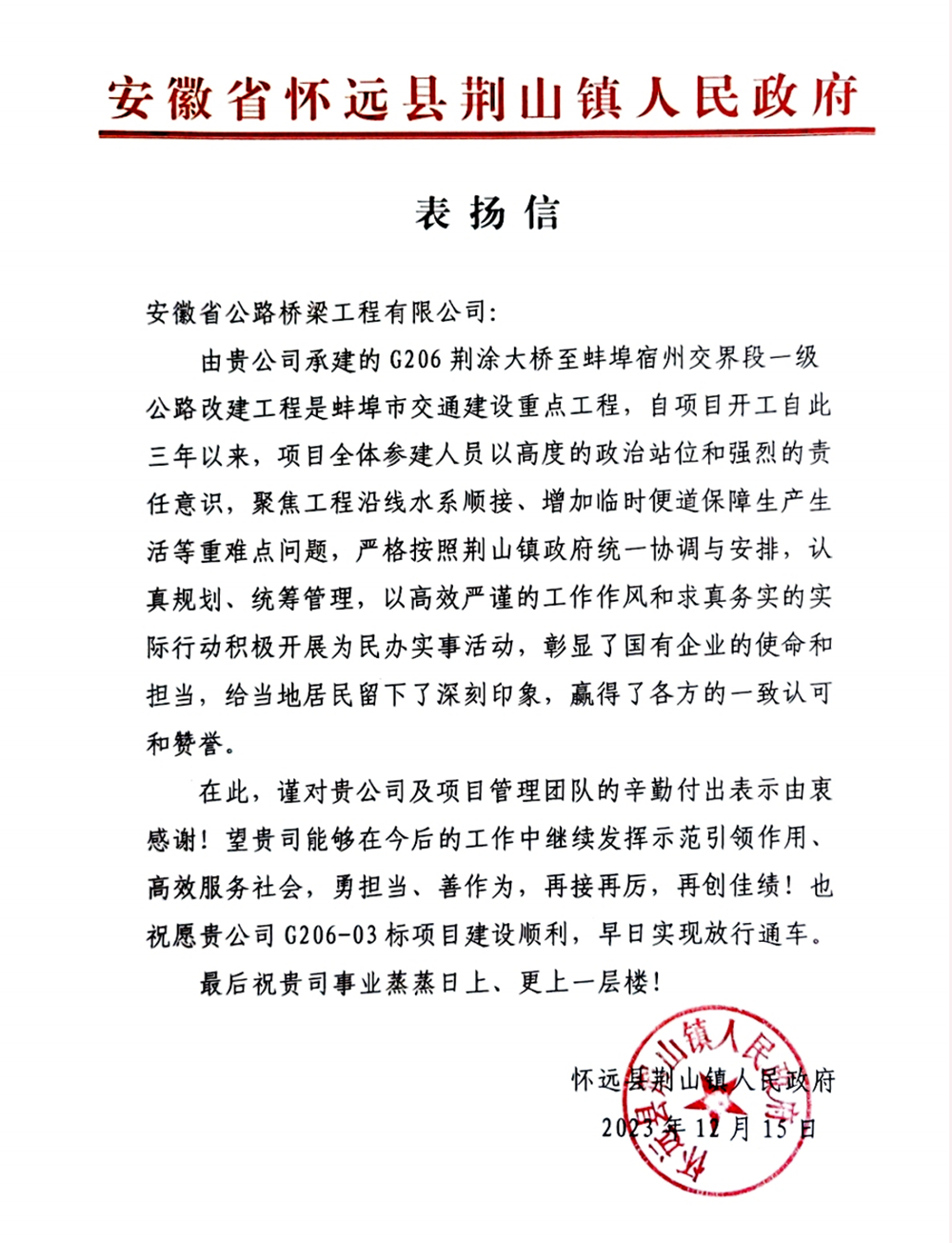 懷遠(yuǎn)縣荊山鎮(zhèn)人民政府來(lái)信表示,G206荊涂大橋蚌埠至宿州交界段一級(jí)公路改建工程03標(biāo)項(xiàng)目全體參建人員積極與政府協(xié)調(diào)配合,推動(dòng)項(xiàng)目高質(zhì)量建設(shè),以實(shí)際行動(dòng)積極開展為群眾辦實(shí)事活動(dòng),踐行了國(guó)企擔(dān)當(dāng)。