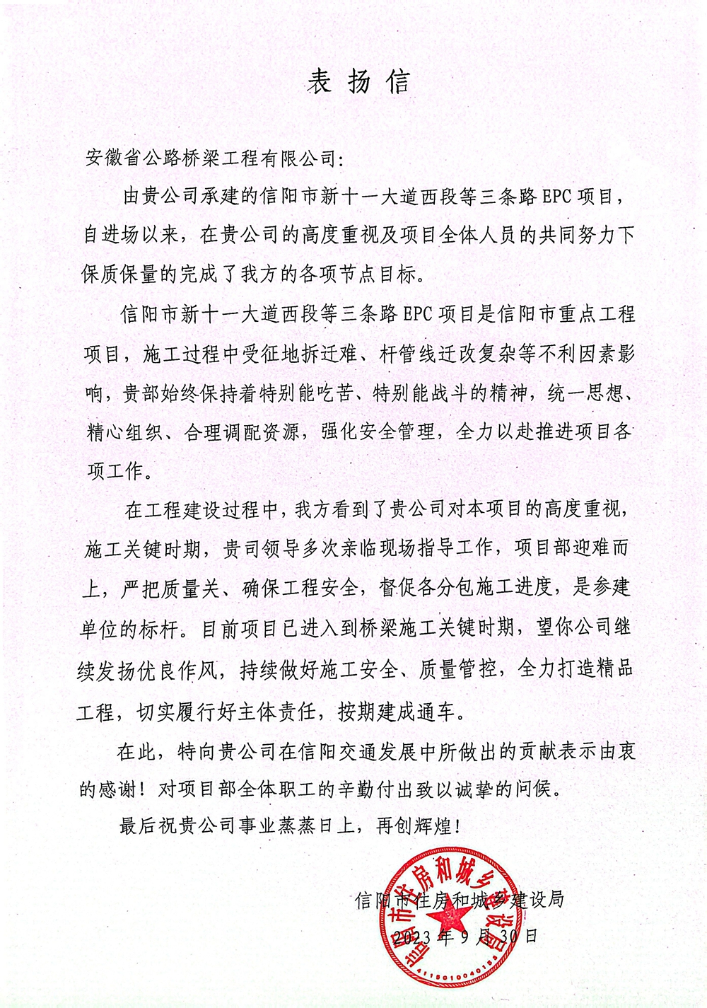 信陽(yáng)市住房和城鄉(xiāng)建設(shè)局來(lái)信指出,信陽(yáng)新十一大道項(xiàng)目在施工過程中克服征地拆遷難、桿管線遷改復(fù)雜等不利因素影響,始終發(fā)揚(yáng)“特別能吃苦、特別能戰(zhàn)斗”的企業(yè)作風(fēng),嚴(yán)把質(zhì)量關(guān)、安全關(guān),高質(zhì)高效推進(jìn)項(xiàng)目建設(shè),為信陽(yáng)交通發(fā)展做出了突出貢獻(xiàn)。