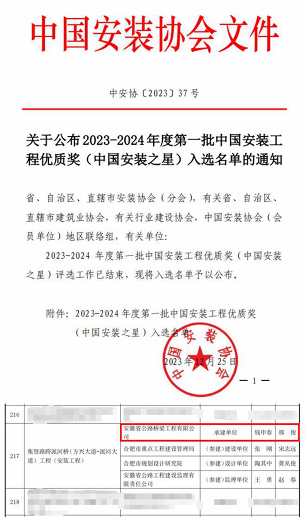 12月25日,中國安裝協(xié)會公布了2023-2024年度第一批中國安裝工程優(yōu)質(zhì)獎(中國安裝之星)入選名單,公司承建的集賢路跨派河橋(方興大道-派河大道)工程榜上有名。此項(xiàng)目是中國安裝工程優(yōu)質(zhì)獎(中國安裝之星)歷年獲獎項(xiàng)目中首個市政橋梁項(xiàng)目,也是公司首個獲得中國安裝工程優(yōu)質(zhì)獎(中國安裝之星)的項(xiàng)目。