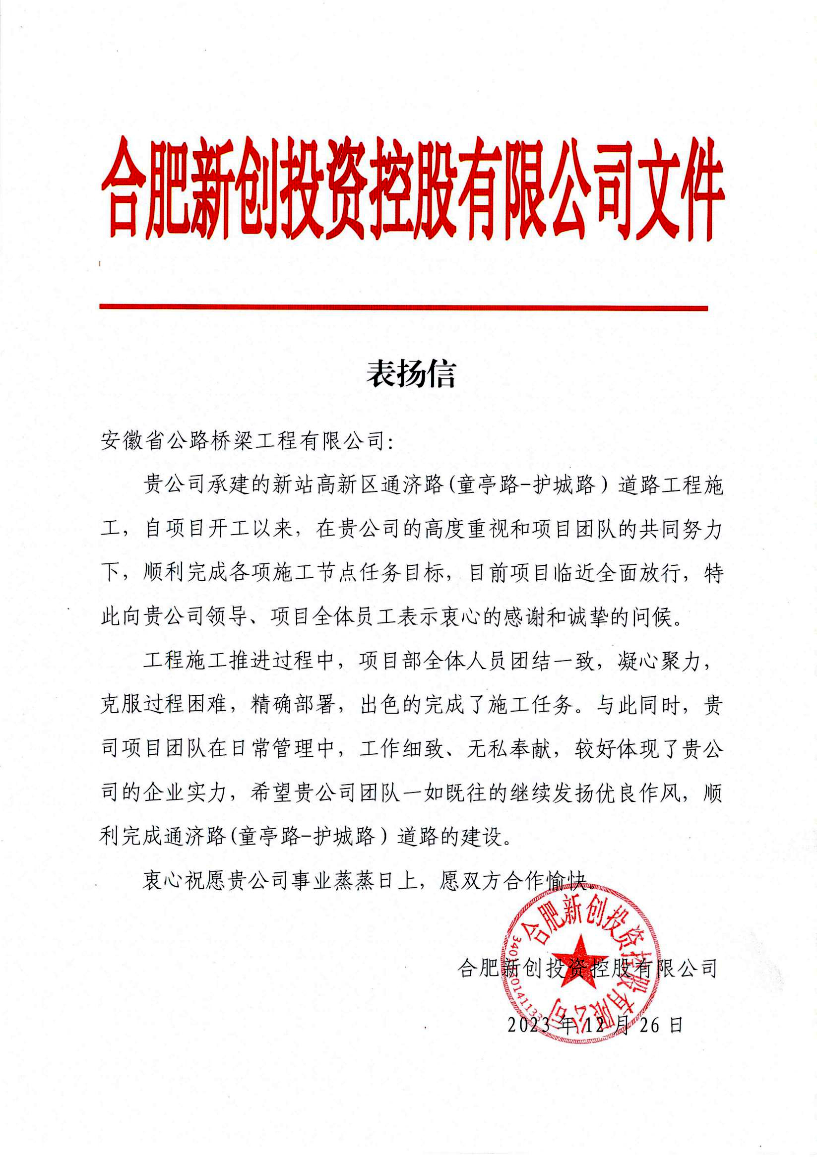 合肥新創(chuàng)投資控股有限公司來信表示,新站高新區(qū)通濟路(童亭路-護城路)道路工程施工推進過程中,項目團隊發(fā)揚路橋鐵軍優(yōu)良作風,咬定目標攻堅克難,持續(xù)加強現(xiàn)場安全文明施工和質(zhì)量管理,圓滿完成各項施工任務,彰顯了國企腳踏實地、久久為功的擔當作風。