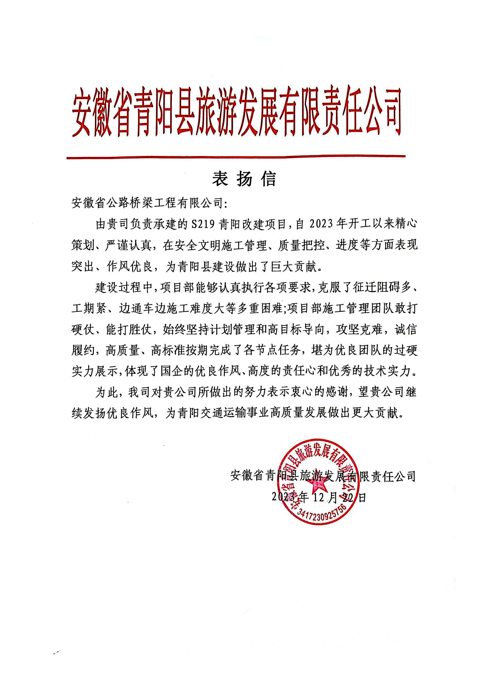 安徽省青陽縣交通運輸局和青陽縣旅游發(fā)展有限公司來信指出,S219青陽蛤蟆嶺至青通河大堤段公路改建工程項目建設過程中,項目施工管理團隊克服了汛期影響大、工期緊、邊通車邊施工難度大等諸多困難,高質(zhì)量、高標準按期完成了各節(jié)點任務,為青陽交通運輸事業(yè)高質(zhì)量發(fā)展做出了巨大貢獻。