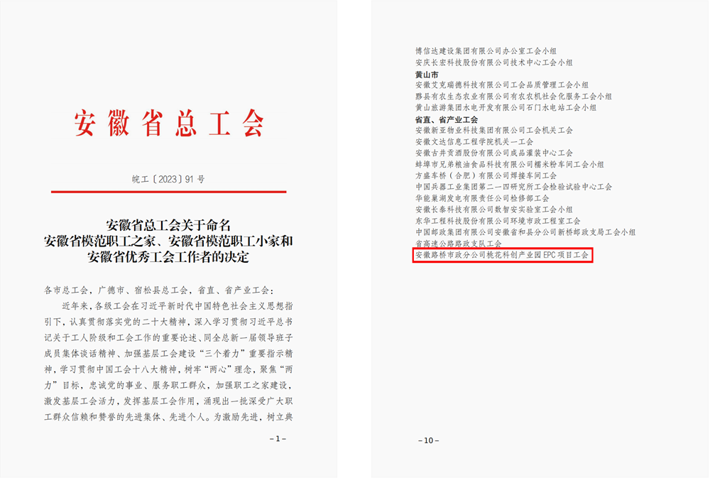 桃花科創(chuàng)產(chǎn)業(yè)園EPC項(xiàng)目工會(huì)榮獲“安徽省模范職工小家”稱(chēng)號(hào)