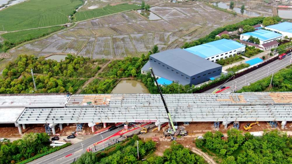 S330分離立交橋總長543米,其中鋼板組合梁長185米,上跨S330省道,采用節(jié)段吊裝施工方案,共分100個節(jié)段。自3月15日首片鋼板組合梁吊裝以來,項(xiàng)目部克服連續(xù)降雨、車流量大等不利因素,迎難而上,精心組織,安全穩(wěn)步推進(jìn)梁板架設(shè)工作,歷經(jīng)35天完成全部鋼板組合梁吊裝。