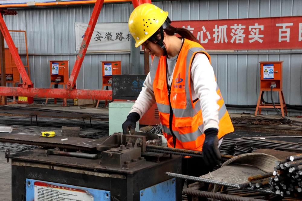 在G329改建工程項目預制梁場的鋼筋加工棚內(nèi),工人正在對預制梁所需要的鋼筋進行彎曲。目前,該項目橋梁已進入橋面系施工階段,路基施工正式進入瀝青攤鋪階段。
