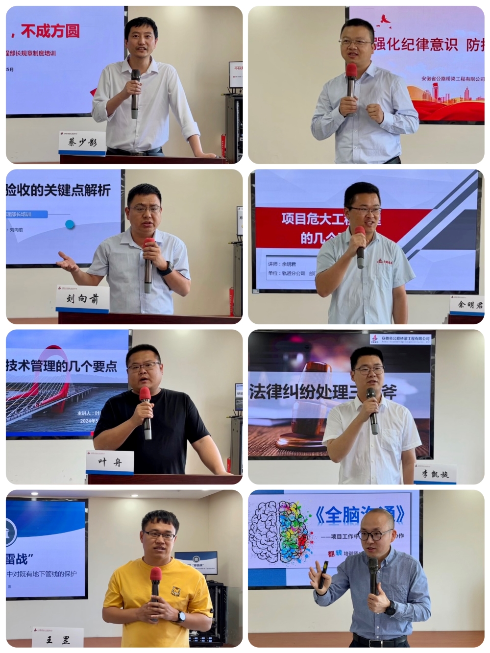 培訓(xùn)采用新老講師結(jié)合的形式,內(nèi)容涉及公司最新規(guī)章制度解析、方案編制和檢查驗收、橋梁工程施工技術(shù)、地下管線保護(hù)、項目危大工程、廉潔教育、法律糾紛處理以及通用管理課程等。
