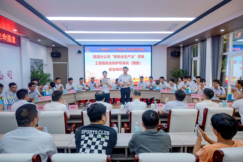 6月29日下午,隧道分公司組織開展“新安全生產(chǎn)法與施工現(xiàn)場安全防護(hù)標(biāo)準(zhǔn)化”知識(shí)競賽活動(dòng)。省交通質(zhì)安中心安全生產(chǎn)監(jiān)管處副處長嚴(yán)搖鈴,分公司領(lǐng)導(dǎo)班子、機(jī)關(guān)各部門負(fù)責(zé)人、所屬項(xiàng)目經(jīng)理及職工代表現(xiàn)場觀賽。