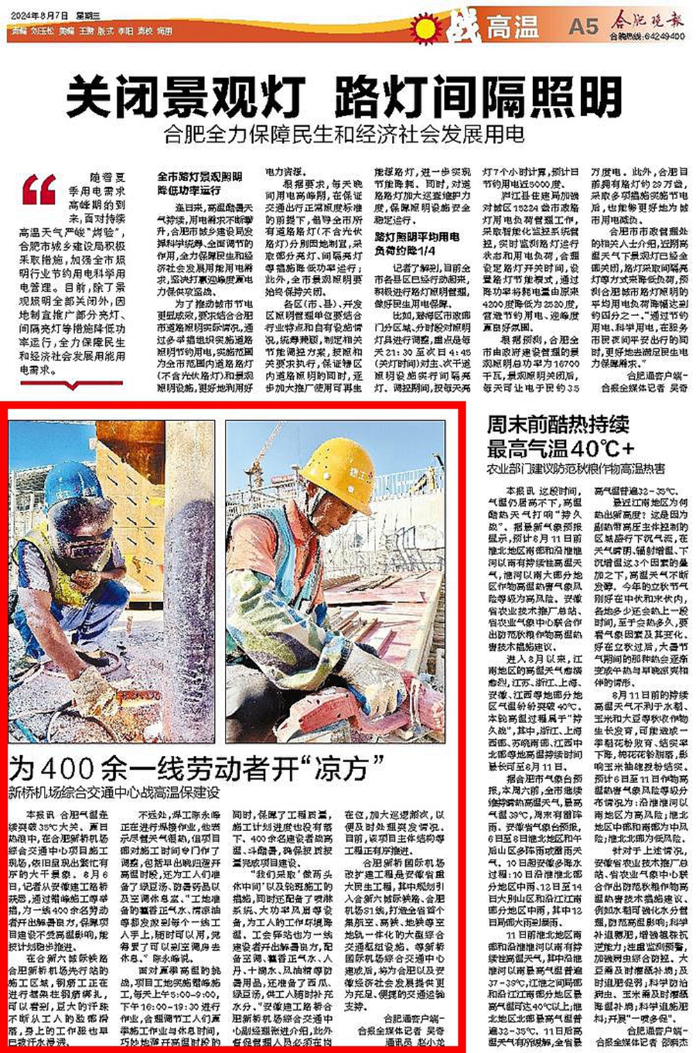 近日合肥氣溫連續(xù)突破35℃大關(guān)。安徽新聞聯(lián)播、安徽日報(bào)、合肥晚報(bào)等多家省市主流媒體深入報(bào)道安徽建工路橋合肥新橋國際機(jī)場綜合交通中心項(xiàng)目戰(zhàn)高溫、保生產(chǎn)。項(xiàng)目開出解暑良方,采取錯時施工、在作業(yè)區(qū)增設(shè)工業(yè)風(fēng)扇等措施,保障高溫天氣下勞動者生命安全和身體健康,確保這一重點(diǎn)工程建設(shè)的生產(chǎn)進(jìn)度,保障項(xiàng)目建設(shè)不受高溫影響穩(wěn)步推進(jìn)。
