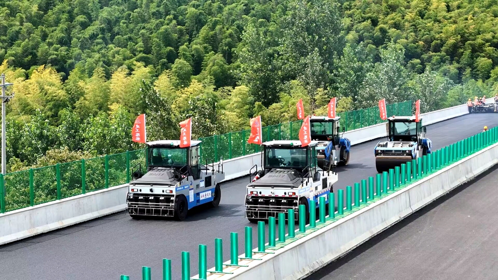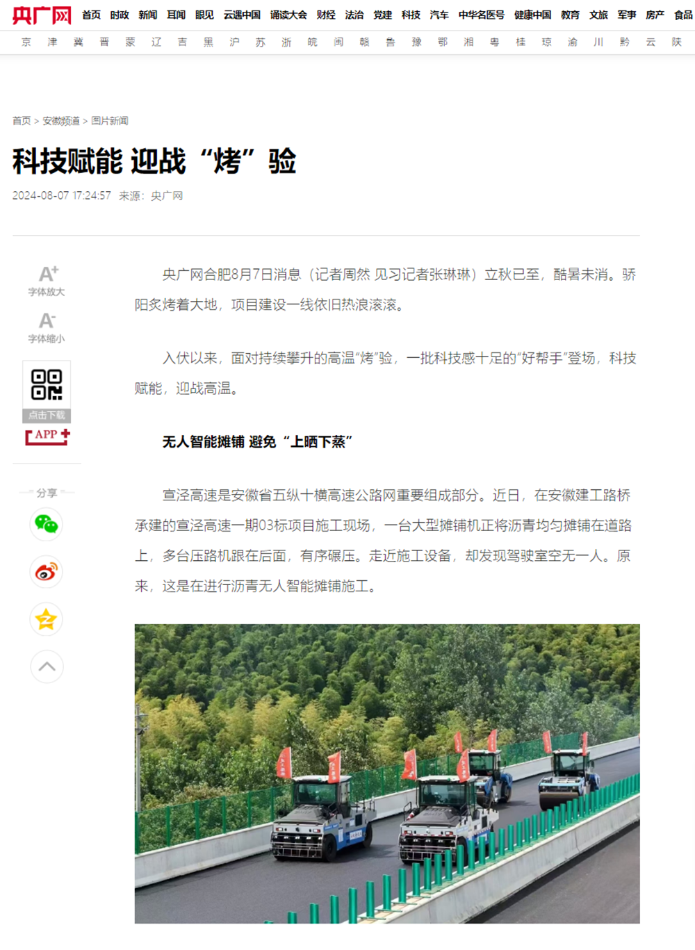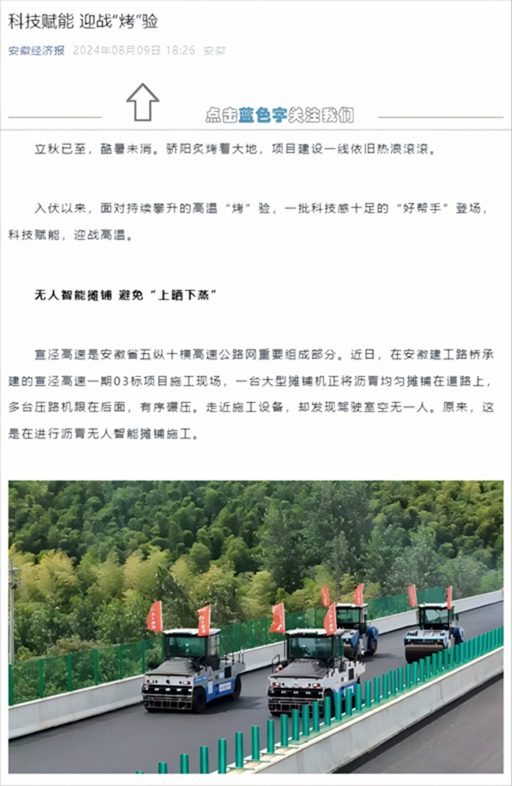 宣涇高速是安徽省五縱十橫高速公路網(wǎng)重要組成部分。近日,在安徽建工路橋承建的宣涇高速一期03標項目施工現(xiàn)場,一臺大型攤鋪機正將瀝青均勻攤鋪在道路上,多臺壓路機跟在后面,有序碾壓。走近施工設備,卻發(fā)現(xiàn)駕駛室空無一人。原來,這是在進行瀝青無人智能攤鋪施工。