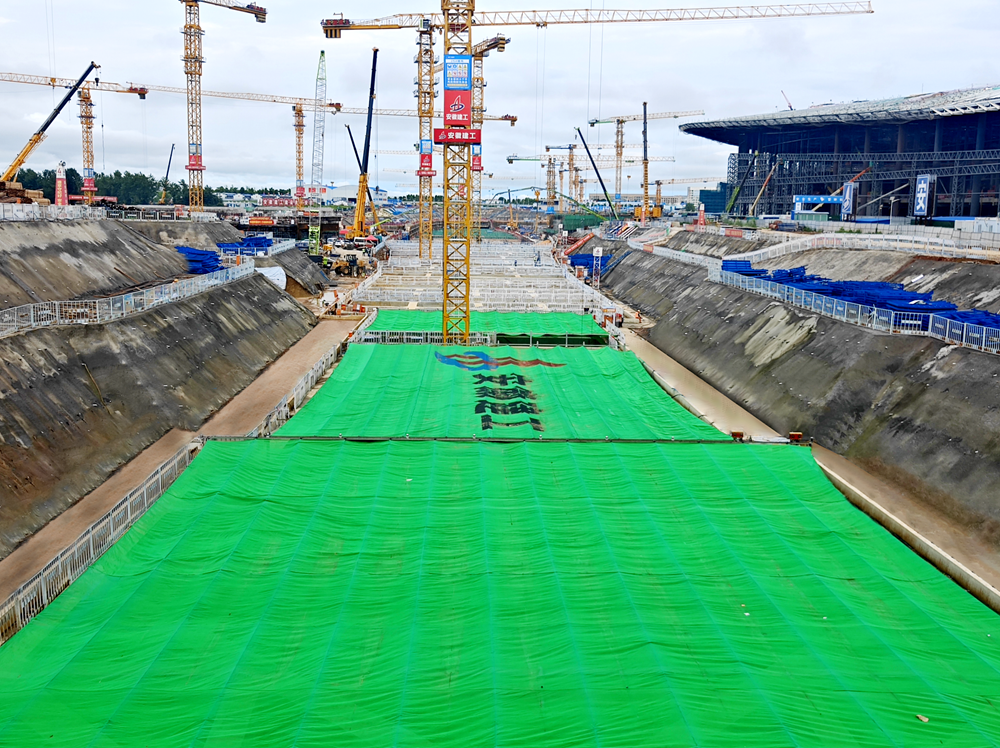 灼灼烈日,人們出行會打起遮陽傘躲避烈日與紫外線侵襲。近日,在合肥新橋機場綜合交通中心項目現(xiàn)場,一項防暑“神器”——大跨度、智能化防塵“天幕”系統(tǒng)投入使用,如同給項目基坑罩上了一把“綠色遮陽傘”。