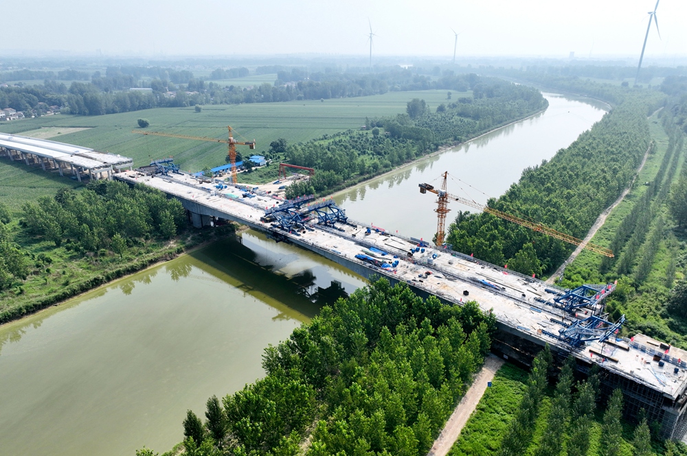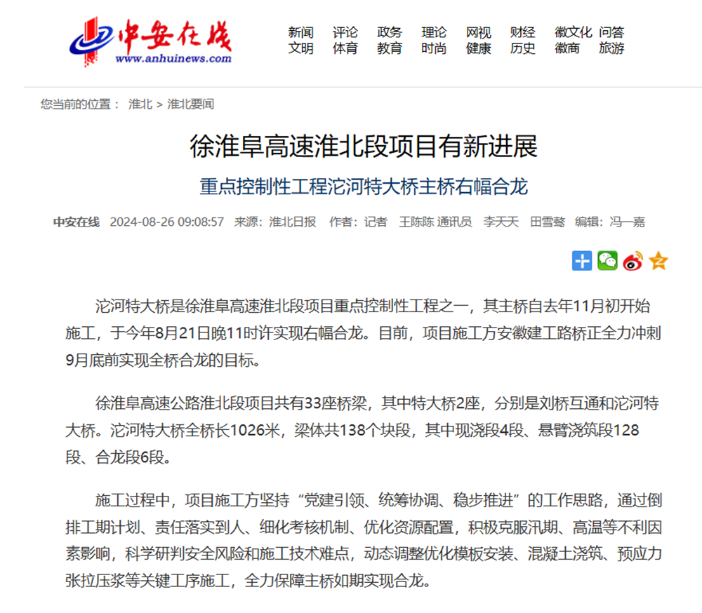 【名媒聚焦】中安在線、淮北電視臺、淮北日報(bào)等主流媒體聚焦徐淮阜高速淮北段項(xiàng)目沱河特大橋主橋右幅合龍