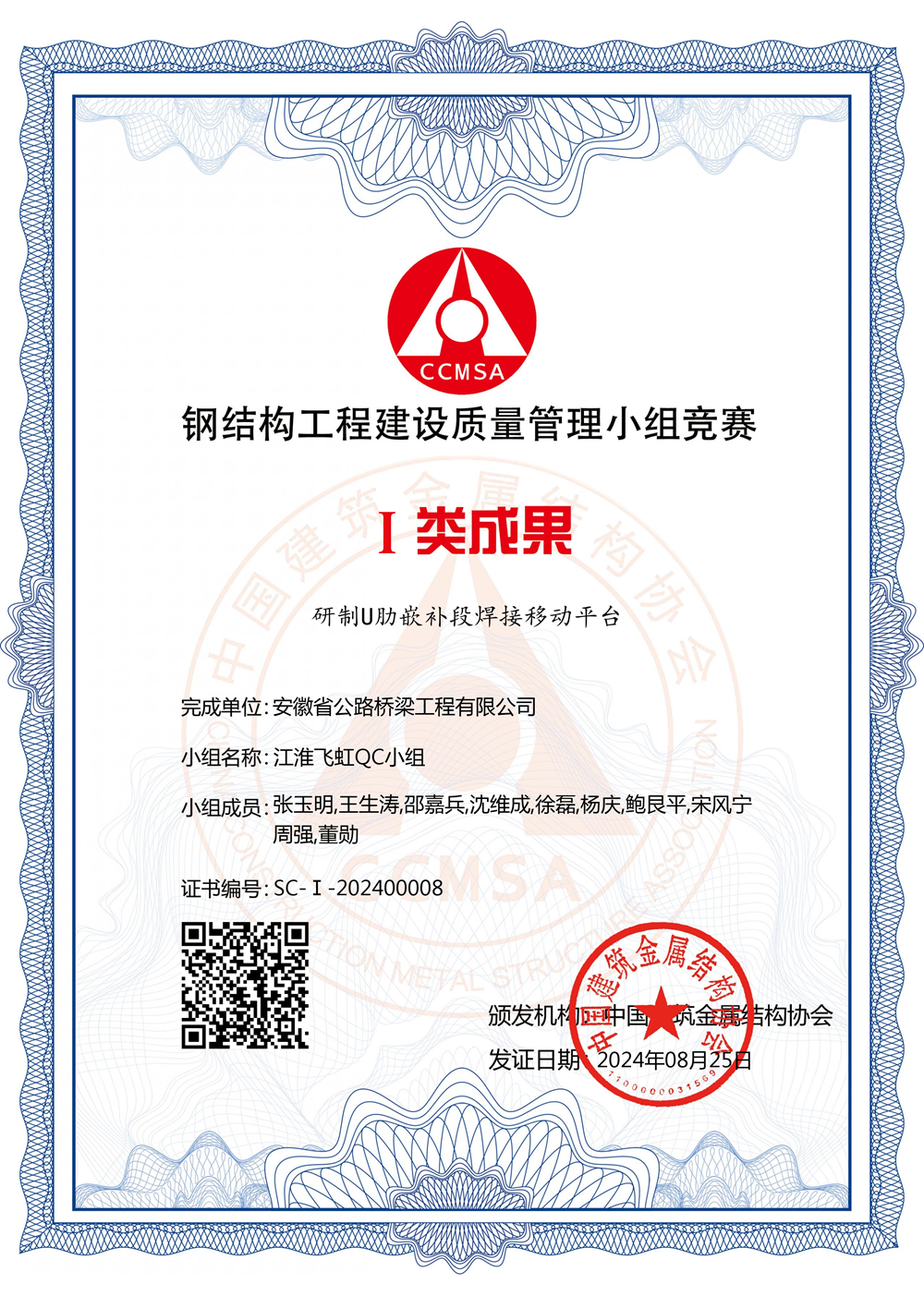 8月23日至25日,中國建筑金屬結構協(xié)會在大同舉辦2024年鋼結構工程建設質量管理小組競賽,公司《研制U肋嵌補段焊接移動平臺》QC成果受到評審專家的一致好評,榮獲Ⅰ類成果,同時作為優(yōu)秀成果案例在表彰大會上作交流。
