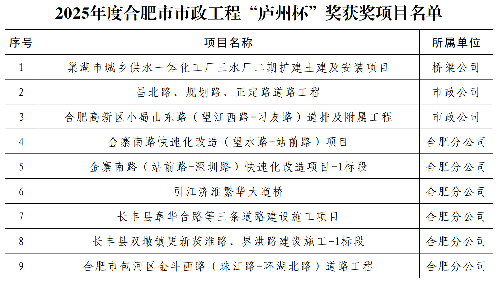 近日,合肥市市政工程協(xié)會公布了2025年度合肥市市政工程“廬州杯”獎(jiǎng)獲獎(jiǎng)項(xiàng)目名單,公司承建的9個(gè)項(xiàng)目榮譽(yù)登榜。