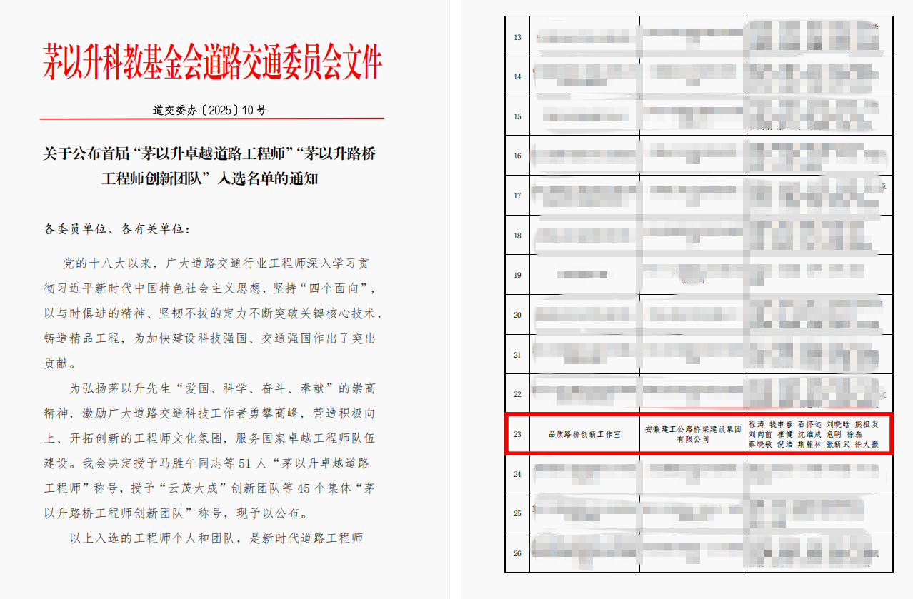 近日,茅以升科技教育基金會(huì)道路交通委員會(huì)公布首屆“茅以升路橋工程師創(chuàng)新團(tuán)隊(duì)”評(píng)選結(jié)果,公司“品質(zhì)路橋創(chuàng)新工作室”憑借扎實(shí)的技術(shù)攻關(guān)能力與突出的工程實(shí)踐成果成功入選。
