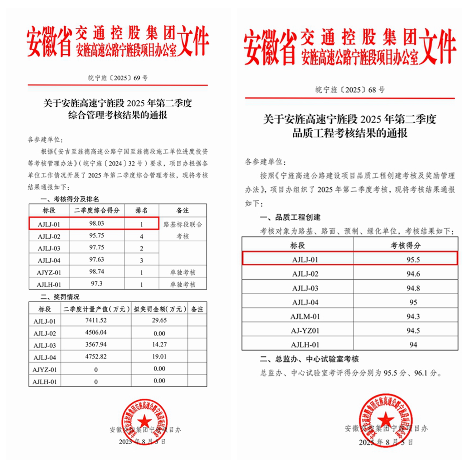近日,安旌高速寧旌段辦公室公布了2025年第二季度綜合管理考核及品質工程創(chuàng)建考核結果,公司承建的寧旌高速路基1標在兩項考核中均獲得施工單位“第一名”。