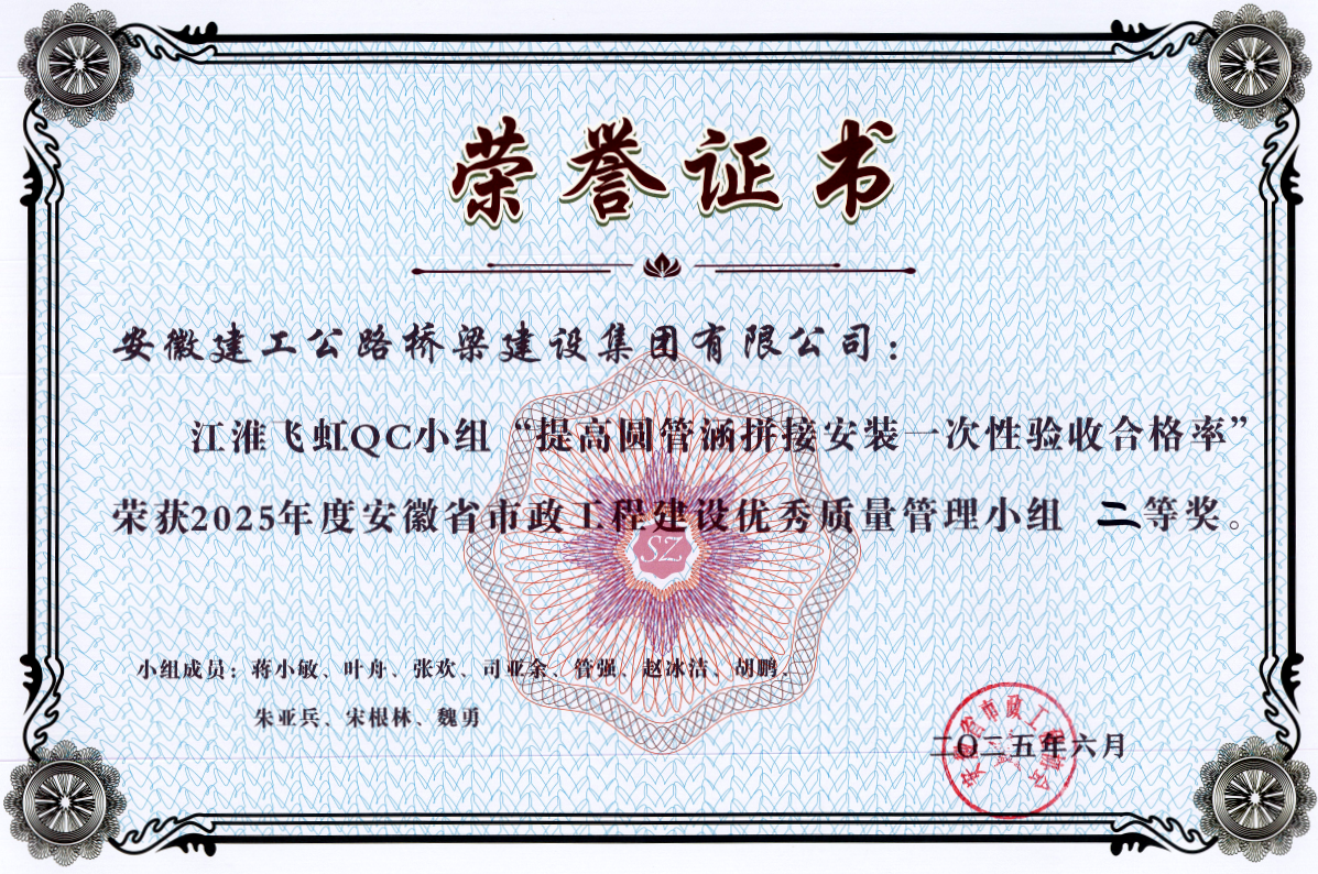 針對圓管涵等小結(jié)構(gòu)物外觀質(zhì)量通病,項(xiàng)目部成立“江淮飛虹”QC小組,聚焦混凝土質(zhì)量、模板工藝、振搗操作及養(yǎng)護(hù)管理等環(huán)節(jié)展開技術(shù)攻關(guān)。其課題《提高圓管涵拼接安裝一次性驗(yàn)收合格率》顯著提升了施工進(jìn)度與實(shí)體質(zhì)量,一次性驗(yàn)收通過省去了整改、復(fù)檢時(shí)間,確保圓管涵施工按計(jì)劃銜接后續(xù)工序,助力項(xiàng)目率先完成全線40道圓管涵施工;合格的拼接安裝減少了后期漏水、沉降、結(jié)構(gòu)開裂等隱患,提升了工程耐久性和質(zhì)量穩(wěn)定性。該成果有效降低了成本損耗、保障了工期推進(jìn),榮獲2025年度安徽省工程建設(shè)質(zhì)量與安全協(xié)會(huì)QC活動(dòng)一等獎(jiǎng)及安徽省市政工程建設(shè)優(yōu)秀質(zhì)量管理小組二等獎(jiǎng)。