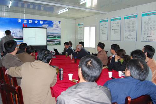 下午,觀摩團一行又驅車來到了金桃橋項目。參觀了現(xiàn)場后,在金寨縣賓館會議室觀摩團一行聽取了項目經理劉曉晗的匯報。隨后各單位技術負責人就項目的箱拱吊裝施工等關鍵技術作了討論和交流。鄭總對該橋目前進展情況表示滿意,并做了總結講話。同時對項目部積極探索和鉆研技術難點的精神表示贊賞。并對公司的質量技術管理工作提出要求,要求格式進一步結合深入學習實踐科學發(fā)展觀,繼續(xù)開展技術的開發(fā)挖掘,進行技術的集成創(chuàng)新,研究、提煉項目工法和專利,為集團公司技術創(chuàng)新多做工作,以增強集團公司的核心競爭力。